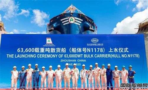 6月30日,舟山中遠(yuǎn)海運重工為Alpha Bulkers公司建造的第2艘63600噸散貨船N1178項目在公司2號船臺舉行上水儀式。