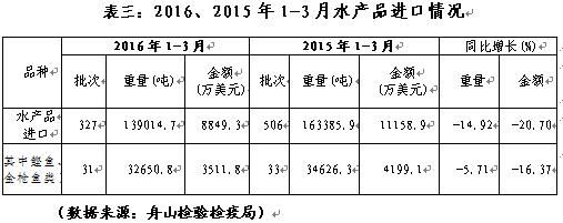 2016年1-3月舟山水產(chǎn)品進(jìn)口下降,具體見(jiàn)表三: