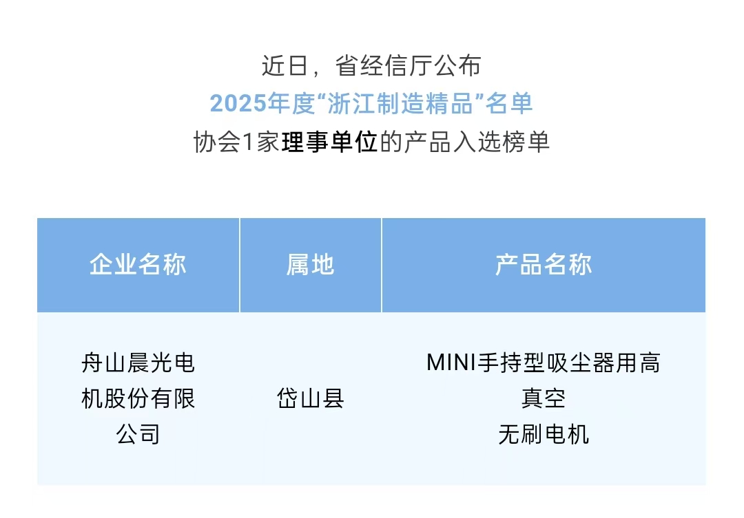 晨光電機產品成功入選,不僅是對其企業(yè)技術創(chuàng)新能力、質量管理水平及品牌價值的高度肯定,更彰顯了行業(yè)標桿的示范效應。這一殊榮將激勵協(xié)會會員企業(yè)以更高標準推進技術創(chuàng)新、強化質量管控,形成"比學趕超"的良性競爭氛圍,為舟山經濟高質量發(fā)展注入強勁動能,助力區(qū)域產業(yè)向高端化、創(chuàng)新化方向加速躍升。